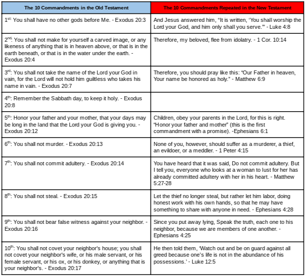 But, you may say that it’s still a sin to murder, to have idols before God, and to steal. Yes, that is true. We do not do those things, as Christians, because Christ instructed us not to do them. The New Testament repeats all the 10 Commandments (except for the 4th one: remember the Sabbath), for us to follow. Since we are under His will and testament, we do not steal, murder, covet, or do any of the other things that Christ has commanded us not to do. Refer to the chart above to see where all of the commandments that were given to Moses at Mount Sinai are repeated in the New Testament, with the exception of Sabbath-keeping (that’s why that section is blank).
